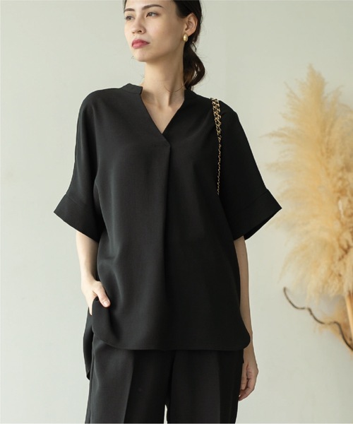 ------------------------------------------------- ▼ お気に入り登録 1600人突破!------------------------------------------------- イージーさと美しさを両立! 抜け感スキッパーブラウス【セットアップ対応】 【デザイン】 ・深めの合わせのスキッパーネックで、デコルテラインをきれいに見せてくれるカッティング。 ・程よく抜け感を演出する、ややゆとりのあるシルエット。 ・二の腕をカバーできる袖丈に落とし込み、袖口を切り替えたデザインをポイントにしています。 ・同素材でのボトムパンツでのセットアップでオンスタイルにはもちろん、デニムなどでカジュアルなオフスタイルにもおすすめです。 ※同素材のテーパードパンツ(637-67002)、ワイドパンツ(637-67004)とセットアップで着用していただけます。 ※豪素材でランタンスリーブブラウス(637-87002)もお作りしております。 【素材】 ・マットな質感と、ドライなタッチがポイントの梳毛調合繊素材を使用。 ・程よい厚みのドライな素材感はシーズンを選ばず着用が可能です。 ・身体のラインを拾い過ぎず、しっかりストレッチは効いているので着心地も快適。 ・天然ライクな見え方でありながら、シワにもなりにくく、イージーケアな素材。 ・マシンウオッシャブルでご自宅でのお洗濯も可能です。 ・アンチピリングも嬉しいポイントです。 【スタッフコメント】 sachiko(174 /骨格ナチュラル/ブルべ) トップスはゆるっとしたオーバーなサイズ感でこなれ感のある印象に。二の腕もしっかりカバーできる長さ◎ストレッチが効いていて着心地も快適です! 【スタッフコメント】 Haruka(159 /骨格ストレート/イエベ) トップスはMサイズでしっかり着丈があるので、すっきり着たい方はサイズをひとつ下げても◎気になる部分をカバーできるので安心感があります。 こちらの商品は主に秋に着用いただける商品です。 モデル情報:身長166cm B72 W57 H84 着用サイズ:38(M) 店舗へのお問い合わせ商品番号:637-87001 ●製品寸法: 36(S):着丈68cm 肩幅72cm 38(M):着丈69cm 肩幅73cm 40(L):着丈71cm 肩幅74cm 42(LL):着丈71cm 肩幅75cm 備考:
