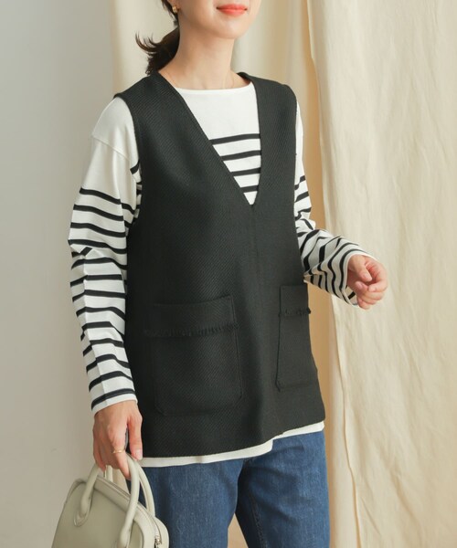 今季注目のツイード生地を使用したVネックベストをご用意。レイヤードを楽しめるようネックラインは大胆なVネックにし、ポケットのフリンジがポイントでカジュアルな印象に見せてくれます。ゆとりのあるオーバーサイズで仕立てや、ヒップ周りをカバーしてくれる着丈も安心できる着用感に。ノースリーブとして一枚ではもちろん、Tシャツやタートルなどをレイヤードしてシーズン長く愛用いただけるアイテムです。【2023 Autumn/Winter】※商品画像は、光の当たり具合やパソコンなどの閲覧環境により、実際の色味と異なって見える場合がございます。予めご了承ください。※商品の色味の目安は、商品単体の画像をご参照ください。▼お気に入り登録のおすすめ▼お気に入り登録商品は、マイページにて現在の価格情報や在庫状況の確認が可能です。 お買い物リストの管理に是非ご利用下さい。
