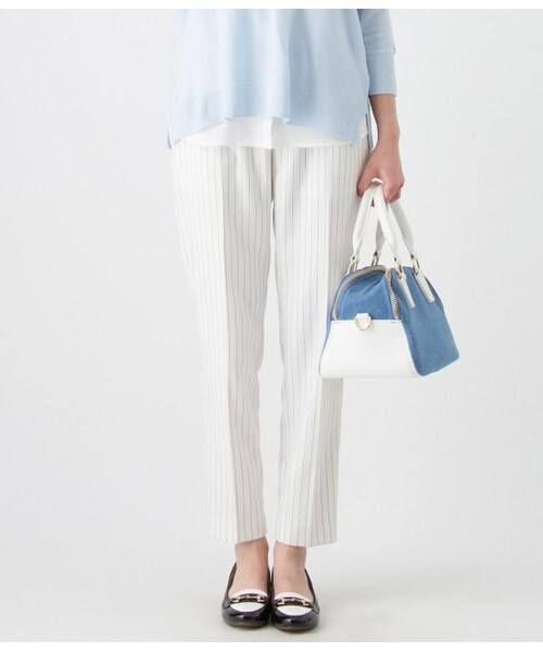 今シーズンも人気のストライプ柄を加えたパンツです。センタープレス入りのすっきりシルエットでオフィス用コーディネートに大活躍間違いなし。ウエストは後ろのみゴム仕様になっているのですっきり見えて着心地も抜群です。白は透け防止の裏地付き。
