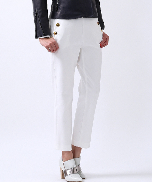 トレンドのマリンを意識したセーラータイプのストレートパンツ。ショート丈トップスと合わてボタンをみせれば、さらにマリンっぽさをだしたスタイリングになります。ポンチ素材でストレッチ性もあり、ウエスト後ろ部分にリブをいれているので、履きやすさも抜群です!model:H168・B81・W59・H88 着用サイズ:2ブランド品番:3490050002