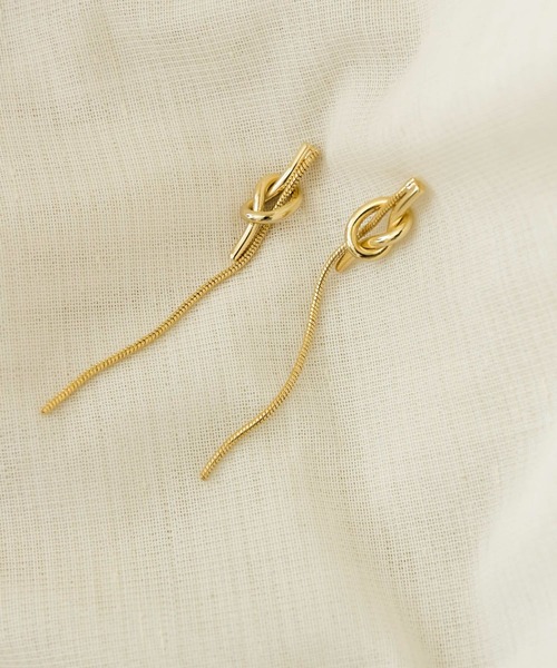 【ノットの立体感】今シーズン注目の結び目=ノットデザインを取り入れたロングシルエットのピアス。ノットモチーフに通したスネークチェーンが動きに合わせて揺れ動くニュアンスたっぷりなディテールに注目です。※メッキ製品は変色してしまいがちです。こまめなお手入れで防止してください。アレルギー体質の方や体調が低下している方など、かぶれることがありますので十分にご注意ください。※この商品は、チタンポストを使用しております。※チタンは金属アレルギーを引き起こしにくい金属の1つで軽くて丈夫、汗などに溶けてイオン化しにくいことが特徴ですがチタンは加工が難しい為、ポスト部分のみに使用され本体は違う金属を使用していることが多いです。※その他お取り扱いに関しましては、商品に付属のアテンションタグをご覧ください。※アレルギーの原因はさまざまです。すべての方に起きないことをお約束するものではありませんので、予めご了承くださいませ。また、症状が出た場合は直ちに使用をお控えください。※商品画像は、光の当たり具合やパソコンなどの閲覧環境により、実際の色味と異なって見える場合がございます。予めご了承ください。※商品の色味の目安は、商品単体の画像をご参照ください。▼お気に入り登録のおすすめ▼お気に入り登録商品は、マイページにて現在の価格情報や在庫状況の確認が可能です。 お買い物リストの管理に是非ご利用下さい。