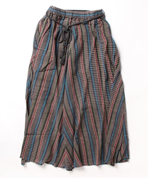 アラビア海を一望できるリゾート地、インドの楽園・ゴアの風景をイメージしたどこか懐かしい色合い。肌触りの良い南インドの綿織り生地で風通しがよく、穿き心地抜群のストライプ柄ロングスカート。風に揺れるAラインのシルエットが美しい、たっぷりとした贅沢なボリューム感。心地良い太陽の季節に心が開放されるよう。リゾート感のあるコーディネートに◎・ウエストゴム紐仕様 MAX~100cm・ウエストマークできるタッセルコード付き。ビーズがアクセントになっています。・両サイドポケット付き。・裏地付き。※こちらの商品は1点1点職人による手作りとなります。その為、生地の取り方により柄の配置や形・色合いなど若干異なる場合がございます。(画像は一例です。)あらかじめご了承ください。※屋外での撮影画像は、光の当たり具合で色味・カラーが違って見える場合がございます。商品のカラーは、スタジオ撮影の画像をご参照ください。Amina Collection Co.,LTD.