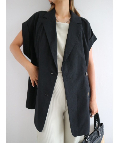【 “お気に入り登録”でお買いものが便利に! 】▼商品のお気に入り登録完売カラーの再入荷時や、ラスト1点の時、セール開始時にお知らせします。▼ブランドのお気に入り登録新商品や再入荷、セール情報など、いち早くTRUNC88のお得な情報を受け取ることができます。ぜひご活用ください。【Item Comment】クレープ生地を使用したショートスリーブダブルジャケット。マットな質感のクレープ生地を使用しているので夏場でもさらっと着用して頂けます。二の腕まで隠れるオーバーサイズでこなれ感のあるルーズな着こなしを演出できます。普段使いはもちろん、オケージョンやオフィススタイル合わせにもおすすめのアイテムです。【Coordinate】Tシャツや、キャミ・タンクと合わせてカジュアルなスタイルにもスタイリッシュに取り入れられます。Satin Parachute Pants・Satin Drawstring Cargo Skirtとも相性抜群のアイテムでおすすめです。【Color Variation】BLACK※着用画像は実際の商品とお色味が多少異なる場合がございます。【Material】裏地:■あり □なし厚み:□薄手 ■普通 □厚手透け感:□あり ■なし伸縮性:□あり ■なし光沢感:□あり ■なし【Model】Director(佐野真依子):162cm