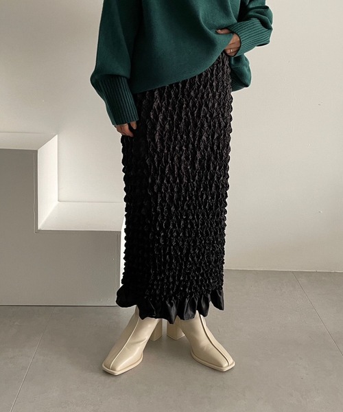 ■素材特性■ 光沢あるサテンに特殊な加工で、 ポップコーンのような凹凸感を持たせた素材。 非常に伸縮性があり、 着用時は体のラインにフィットしつつ、 締め付け感なく着用して頂けます。 ■デザイン■ 大きくポコポコした表面感の加工の施された、 サテン素材の生地が新鮮なタイトシルエットのスカート。 裾をフリルにすることで可愛いらしさもプラスしました ■スタイリング例■ 光沢感のある素材なので、 今年トレンドの毛足の長いニットなどとも相性良く、 スタイリングが出来るアイテムです。 裾がフリルになっているので、 カジュアルなウラケともスタイリング可能です。 足元はブーツ合わせがおすすめです。