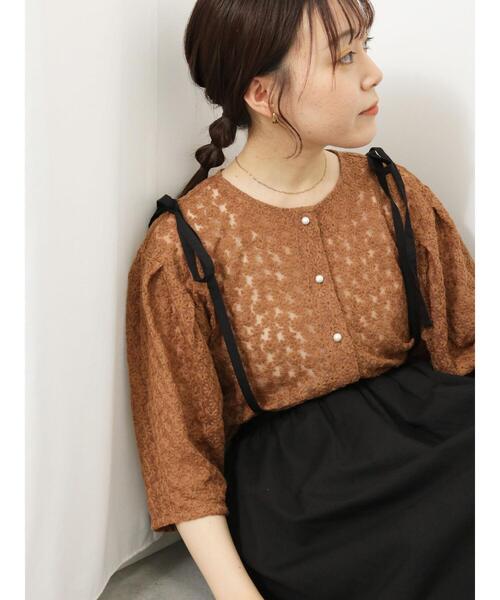 花模様で愛らしい印象に仕上げたレースブラウス。 首のラインや顔周りをすっきりと見せてくれるノーカラーもポイント。丸みのあるスリーブも女性らしい印象を与えてくれます。 ブラウスとしてはもちろん、前ボタンを開けてライトな羽織り代わりとしても◎ ※商品画像は、撮影環境やお客様のご利用のPC・スマートフォンのモニター環境などにより実物と色味に差異がある場合がございます。