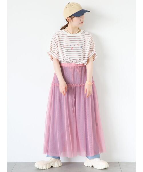 透け感のあるチュール素材が柔らかなムードを演出するワンピース。ショルダーストラップは取り外し可能なので、スカートとしても着用いただけるので、パンツスタイルとレイヤードしたコーディネートもおすすめ◎いつものスタイリングにプラスするだけで雰囲気の変化を楽しめるアイテムです。※商品画像は、撮影環境やお客様のご利用のPC・スマートフォンのモニター環境などにより実物と色味に差異がある場合がございます。【その他採寸】F ウエスト:[ゴム仕様]80cm