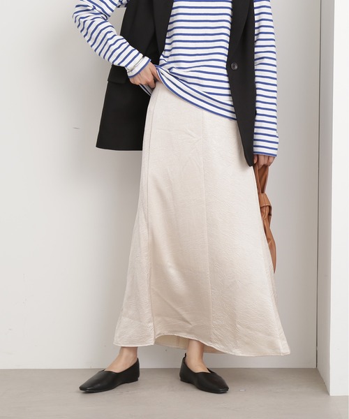 ほんのりと立体感のあるクラッシュ加工(シワ)がこなれた雰囲気を引き立てるサテンスカート。すとんと落ち感のある素材は歩くと動きがでて、女性らしいニュアンスシルエットを演出します。Tシャツやカットソー、ゆるっとしたニットなどもラフになり過ぎずに着用いただけます。※膝上丈まで裏地あり**********************透け感:なし裏地:あり伸縮性:なし光沢感:ややあり生地の厚さ:普通**********************【スタッフ着用コメント】身長:168cm/体型:普通/普段サイズ:M/着用サイズ:M【サイズ感】フリーサイズですが身長168cmの私でも足首が少し見えるくらいのロング丈で着ることができました.!!【着心地】滑らかな柔らかいサテン素材で、触っていてとても気持ちいいです♡裾にかけて広がるシルエットなので足さばきも良く動きやすかったです!裏地がしっかりついているのでインナーのラインが響かず安心感がありました!!