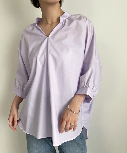 -point- & -styling- 夏らしい涼し気カラー展開の抜け感ブラウス ・首元をすっきり見せるVネックのスタンドカラー。 ・ドロップショルダーとゆとりあるシルエットが今年らしい印象。 ・こなれ感をプラスするドルマン袖。 ・ギャザーデザインでバックスタイルも綺麗に見せてくれます。 ・体型カバーも叶うサイズ感と合わせやすい丈感です。 ----------- 透け感…オフホワイト/パープル あり 伸縮性…なし 光沢感…なし 生地の厚さ…普通 ---------- ※モニター・環境等により実際の商品と多少色味が異なって表示される場合がございます。 予めご了承をお願いいたします。 ======================= ■袋梱包の為、染料による特有の匂いが抜けきれず、匂いがする場合がございますが不良品にはあたりません。 上記注意点での返品、交換はお断りします。ご了承の上お買い求めくださいませ。 ■本製品は生産過程におきまして色味、サイズ感等若干の誤差が出る場合がございます。予めご了承くださいませ。 ======================= 【お買いものをお楽しみいただく為に!】 ▼商品のお気に入り登録 完売カラーの再入荷通知や、ラスト1点の通知、セールの通知も受け取ることができます。 ▼ブランドのお気に入り登録 新商品や再入荷など、いち早くブランドのお得な情報を受け取ることができます!