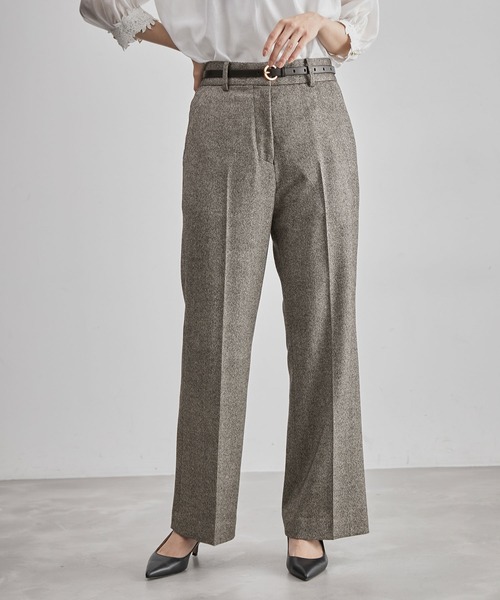 【素材】 シックで上質さの漂うウールレーヨンストレッチのネップヘリンボーン素材を使用。今年注目のマニッシュな中に艶感を加えたしなやかな素材です。 【デザイン・シルエット】 美脚シルエットスラックスは膝上で少し絞りを入れたセミフレアーシルエット。足長効果のあるハンサムデザイン。腰回りはスッキリとしているので女性らしさを引き立ててくれます。 【カラー】 チャコールグレー系の1色展開 【おすすめのスタイリング】 同素材のジャケット(品番:GGV33050)とセットアップがおススメですが、ハンサムなパンツなのでブラウスやスタンダードなアンサンブルニット合わせ、エレガンスなボウタイブラウス合わせなどもおススメです。 ---------------------------- 透け感:なし 裏地:なし 伸縮性:あり 光沢感:少しあり 生地の厚さ:中肉 ポケット:あり 開き方:ファスナー 洗濯方法:ドライクリーニング ---------------------------- 【モデル情報】 モデル身長:168cm 着用サイズ:38 【雑誌掲載】 Oggi 10月号(8月28日発売)P40,P41,P43,P44, #07グレー 掲載 ※画像の商品はサンプルです。実際の商品と仕様、加工、サイズが異なる場合がございます。 ※撮影場所やライティング、お使いのモニター環境によって色の見え方が異なる場合がございます。 ※商品のカラーは画像の色味をご参照ください。動画は仕様説明のため、色味が実物と異なる場合がございます。