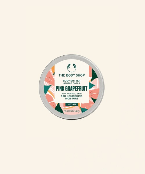 お友達へのプレゼントやお世話になった人へのギフトにもおすすめ! クリーミーで、常温バターのようにとろけるテクスチャー、あと肌しっとりした保湿感、フレッシュでジューシィなピンクグレープフルーツの香りのボディクリーム <ボディクリーム>96%自然由来成分配合で、クリーミーで常温バターのようにとろけて肌に伸び、うるおうのにべたつかないテクスチャーの、ピンクグレープフルーツオイル(整肌成分)を配合したボディクリーム。肌をうるおいで満たし、みずみずしい透明感ある肌に導きます。フレッシュでジューシィなピンクグレープフルーツの香りで、すっきりとポジティブな気分をもたらします。保湿成分シアバター・セサミシードオイル配合で、乾燥して固くなった肌をうるおいで満たし、やわらかくなめらかな肌を長時間保ちます。 <テスクチャー・仕上がり> ・クリーミーで、常温バターのようにとろけるテクスチャー:クリーミーバター・あと肌しっとりした保湿感 <お肌のタイプ> ノーマルスキン 【シリーズ特徴】 ※ボディバター全種類に共通しておりますー独自のバターテクスチャーで、長時間うるおいを感じる肌へーすべてのボディバターに、コミュニティフェアトレードの保湿成分シアバターを配合し、長時間うるおいをキープ。ーヴィーガン認証ーヴィーガン認証の代表的な存在であるヴィーガン協会から認証を受けた動物にも優しい商品です。ーパッケージー100%リサイクル可能な容器は、インドのプラスチックフォーチェンジ社のコミュニティフェアトレード再生プラスチックを使用。アルミの蓋も100%リサイクル可能となっており、よりサステナブルなパッケージに進化しました。 ご使用方法: 入浴後、または乾燥が気になるときに、軽くマッサージするようにお肌になじませてください。 --------------------------------------------------- お気に入り登録 ♥ をしていただくと THE BODY SHOPの最新情報をお届けします --------------------------------------------------- ♥ 商品のお気に入り登録 → 再入荷 や ラスト1点 などのお知らせをお届け ♥ ブランドをお気に入り → 新商品情報 などのお知らせをお届け --------------------------------------------------- <ザボディショップについて> あらゆるジェンダーや年代、肌質の人に、心地よく美しい毎日と豊かで持続可能な地球環境へとつながる変化をもたらすビューティブランド「ザボディショップ」 ザボディショップは、ありのままの美しさを通して人や社会、地球に変革を起こしていく、イギリス発のトータルビューティブランドです。世界中から集めた選りすぐりのナチュラルな原材料を用い、スキンケア、ボディケア、フレグランス、メイクアップといったあらゆる製品を展開。その歴史は、1976年に創業者のアニータ・ロディックが、郊外の港町で天然原料をベースにしたビューティ製品の店をオープンしたところから始まりました。