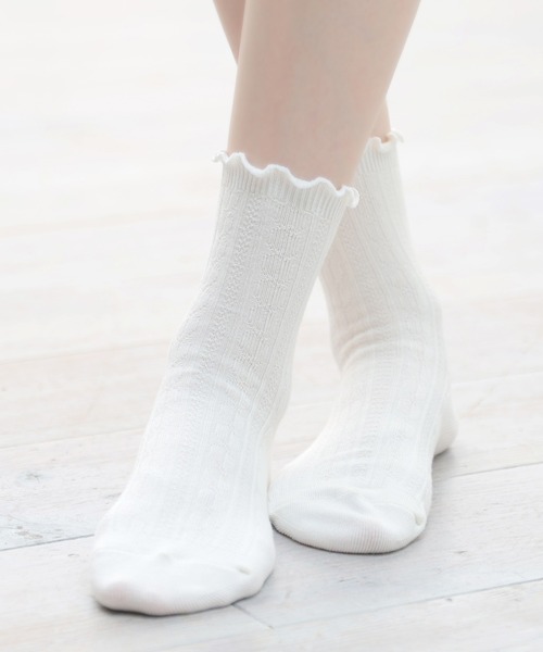 編地&メローがキュート 【デザイン】 ナチュラル可愛いケーブル編みで、ベーシックなクルー丈。 履き口のメローで、よりキュートな印象に。 【スタイル】 スニーカーのほか、フェミニンなパンプスやマニッシュなシューズなど、幅広いテイストに好相性。 ※注意:色の違うものと一緒に、長時間洗濯液につけないで下さい。 【お断り】衛生商品のため、一度でもご試着・ご使用された商品の返品・交換はお受けできません。(不良品は除外) 品番:282-124-7265