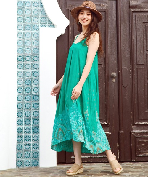 エキゾチックで妖艶な雰囲気漂うキャミワンピース。 繊細な模様のプリントが目を惹きます。胸元のビーズ使いもポイント。 軽やかなクレープ素材で、夏のエスニックスタイルにおすすめなデザインです◇◆ ・肩紐長さ調節可能。 ・裏地無しで透け感がありますので、重ね着がおすすめです。 ※こちらの商品は1点1点職人による手作りとなります。その為、生地の取り方により柄の配置や形・色合いなど若干異なる場合がございます。あらかじめご了承ください。 Amina Collection Co.,LTD.