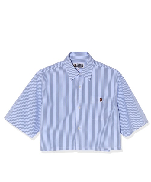 超長綿のコットンタイプライター素材を使用したストライプシャツ。左胸にパッチポケット、ポケット縁にAPE HEADのワンポイントワッペンを配置した仕様。アームが太くドロップショルダーとなった身幅にゆとりのあるシルエット。着丈が短めに仕上げたレディースワイドフィットシルエット。1色、レディース2️サイズ展開。