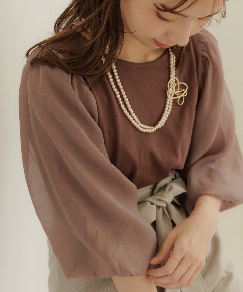 カットソーとシフォン生地を組み合わせた透明感たっぷりなトップス♪カットソー素材ですがカジュアルな雰囲気になりすぎず、ブラウス感覚で着ていただけます。身頃のカットソーはさらっとした落ち感のある生地を使用し上品な印象に仕上げました。ふんわりと二の腕を包み込むようなバルーン袖は、シアー感がきれいなシフォン生地を選び繊細な雰囲気に。肩幅が気になるという方にも着ていただきやすいシルエットにこだわりました♪デイリー使いにはもちろん、お出かけやデートにもおすすめです。一枚でトップスとしても、レイヤードスタイルのインナーにも◎幅広く活躍してくれるアイテムです。【お買い物を上手にお楽しみいただくためのPOINT2つ】◎ 購入ボタン横の ♡ (ハートマーク)をクリック! 完売カラーの再入荷通知、残り1点の通知、セールの通知を受け取れます。 (クリックまたはタップで商品のお気に入り登録♪)◎ ショップのトップページにある ♡ (ハートマーク)「お気に入りショップに追加」をクリック! 新商品や再入荷等、いち早くブランドのお得な情報を受け取れます。 (ブランドのお気に入り登録♪)
