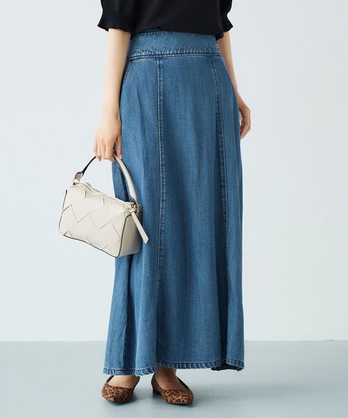 テンセルが入った落ち感のある素材感が新鮮なデニムスカート。 コットン素材のデニムよりもドレープが出やすく、フレアシルエットが綺麗に表現できます。 ●ポイント 太めのウエストベルトがトップスインした時にポイントになります。 太ベルトで目線が上にあがり、腰回りがすっきり見える仕様です。 ●おすすめコーデ 短丈トップスやすっきりめのTシャツ・リブニットなど コンパクトなトップスとの合わせがバランスが良いです。 ==================== 透け感:なし 裏地:なし 伸縮性:なし 光沢感:なし 生地の厚さ:普通 ポケット:あり ==================== 【スタッフ着用コメント】 <スタッフA> 40代前半/152cm/骨格ウェーブ/普段サイズS-M/着用サイズ36 サイズ感:ちょうどウエスト位置でフォールドする。 素材感: 薄手で嵩張らない。カジュアル素材だけど、シルエットは綺麗め。 着用感:軽くて履きやすい。秋はジャケット合わせや、厚手ニットとも相性良い。 <スタッフB> 30代/161cm/骨格ウェーブ/普段サイズ36-38/着用サイズ36 サイズ感:ウエストはフィット感あり、広がりすぎないシルエットです。 素材感: 厚手すぎない素材感です。 着用感:見ためよりも薄手で軽く、今時期から履きやすいスカートです。 <スタッフC> 20代後半/164cm/骨格ストレート/普段サイズM-L /着用サイズ38 サイズ感:ぴったり 素材感:やわらかいデニム素材 着用感:ウエストがしっかりしているので細見えする <スタッフD> 30代前半/167cm/骨格ウェーブ/普段サイズ38-40/着用サイズ38 サイズ感:ウエスト周りはすっきりとしています。足首が見える丈感。 素材感:柔らかいため、肌触りが良くデニムでも軽い着心地。 着用感:上品な広がりでデニムでもカジュアルすぎず、女性らしいデザイン。ブラックはきちんと見えもします。 ※商品はサンプルで撮影しております。 実際の商品と仕様、加工、サイズが若干異なる場合がございます。