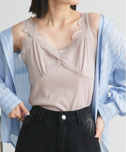 繊細なレースが上品で可愛いインナー! Vネックなので顔周りがすっきり見えるのも嬉しいポイント素材、色味について 裁断によって、模様の配置が写真と多少異なる場合があります 撮影時のライティング、モニター・PC環境により色味が異なって見える場合がございます 商品画像と実物では多少色味に違いがございますので、ご了承の上お買い求め下さい 伸縮性 あり 透け感(淡色) なし 透け感(濃色) なし 洗濯表記 【洗濯処理】 水温40℃を限度に、手洗いできます 【漂白処理】 漂白できません 【タンブル乾燥】 タンブル乾燥禁止です 【自然乾燥】 日陰で、つり干しします 【アイロン仕上げ】 110℃を限度に、スチームなしでアイロンが使えます 【ドライクリーニング】 ドライクリーニングはできません 【ウエットクリーニング】 非常に弱い操作による、ウエットクリーニングができます 【洗濯表記説明文】 同系色と一緒に洗う 洗濯ネット使用 蛍光増白剤禁止 あて布使用 Attention 【お取り扱い上のご注意】 ・この製品は生地の特性上、洗濯によって多少縮む場合がございますので、ご注意下さい ・蛍光増白剤の入っていない洗剤を使用して下さい ・水洗いで移染しやすいので、他のものと分けて洗って下さい ・濡れたまま重ねたり、丸めたりしないで、形を整えて直ぐに干して下さい ・濃色のものは染料の性質上、擦られると色移りすることがありますのでご注意下さい ・汗や雨で湿った場合、着用中の摩擦により他の物に色が移る場合があります ・洗濯後に多少の型くずれ、斜行(製品がねじれて見える状態)が起きますので、あらかじめご了承下さい ・タンブラー乾燥禁止 【製品のお取り扱いについて】 この製品は風合いを重視しているため、毛玉が発生する場合があります これは、素材の特性上避けられない現象で、その発生を完全に防止することはできません 1日着用したら2日休ませるなどローテーションをして着用して下さい 無理に引っぱって取ろうとせず、ハサミや毛玉取り器などで取り除いて下さい この製品は、素材の性質上、引っかけ・引っかかりやすい性質をもっております 着脱時には下記の点に十分ご注意下さい ・着脱時にベルト、バッグや周囲の壁など表面の粗いものとの摩擦や引っかかりに注意して下さい ・水洗いやクリーニングの際にもネットを使用し、他の物との引っかかりにご注意下さい 【注意事項】 商品をお安く提供させて頂く為、検品後のアイロン掛けは省略させて頂いております 簡易梱包の為、たたみ皺があると思いますが、ご了承ください 海外輸入品の為、商品の細部仕様は予告なく変更になる場合がございます 染色過程や素材の特性上、特有のにおいが残る場合がございます 気になる場合は陰干ししていただくか、お洗濯をしていただくことで、においは軽減します 染色の性質上、移染の恐れがあります 他のものと一緒に洗濯しないようご注意ください また、ご使用の際、淡色のものに色移りしますのでご注意ください ご了承の上お買い求め下さい