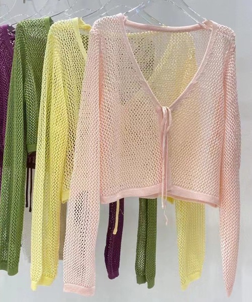 透け感がかわいいサマーニットカーディガンです。 大きめのVネックラインなので中はタンクトップやTシャツなどを着ても快適です。 丈感はショート丈なので脚長効果も期待できますし、ワンピースなどと合わせてもシルエットを邪魔しないのでおすすめです! 紫外線対策や冷房対策などに1枚持っておくと安心! カラー展開も豊富なのでよく着るコーディネートカラーに合わせたり、ワンポイントになるカラーを選んでもかわいいです。