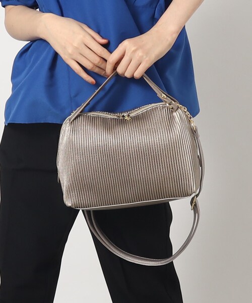 【デザイン】 柔らかいフェイクレザーに細かいプリーツ加工を施したショルダーバッグ。 ダブルファスナーが開閉がしやすく大きく開くので出し入れしやすいデザインです。 ショルダーサイドのチェーン使いがフェミニンです。 2本のハンドル付きで持ちやすく、容量もたっぷりです。 ※ポケット数:内側×5 店舗へのお問い合わせ商品番号:769-07027 ●製品寸法: 00:高さ17cm 幅(上部)22cm 幅(下部)24.5cm マチ9cm 持ち手上がり8cm ショルダー対応サイズ74.5~134.5cm 備考:重量:約295g(サンプル重量)