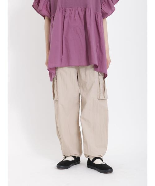 トレンドのシャカっとしたナイロン素材を使用したカーゴパンツです。 裾がドロストで形を変えられます。 Tシャツやフリル系の甘さのあるトップスと合わせても◎※商品画像は、撮影環境やお客様のご利用のPC・スマートフォンのモニター環境などにより実物と色味に差異がある場合がございます。【その他採寸】F ウエスト:[ゴム仕様]68cm