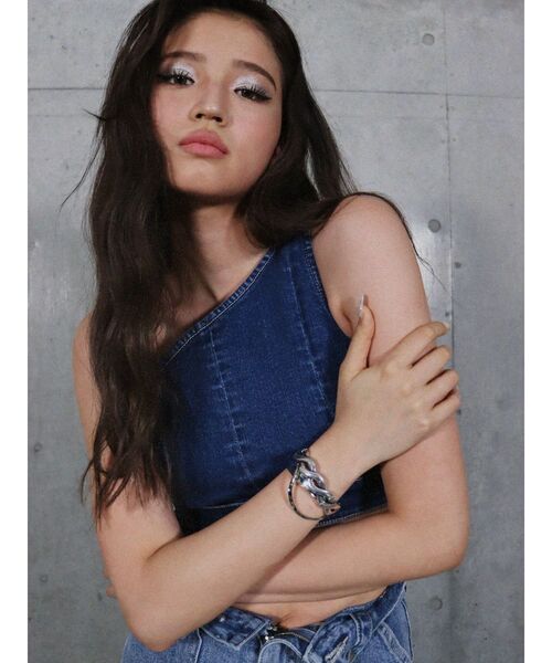 【10周年DENIM CAPSULE COLLECTION】 伸縮性の効いたデニムワンショルダートップスです。 1枚で着たり、シャツの上からビスチェ風に着て頂くのもオススメです。
