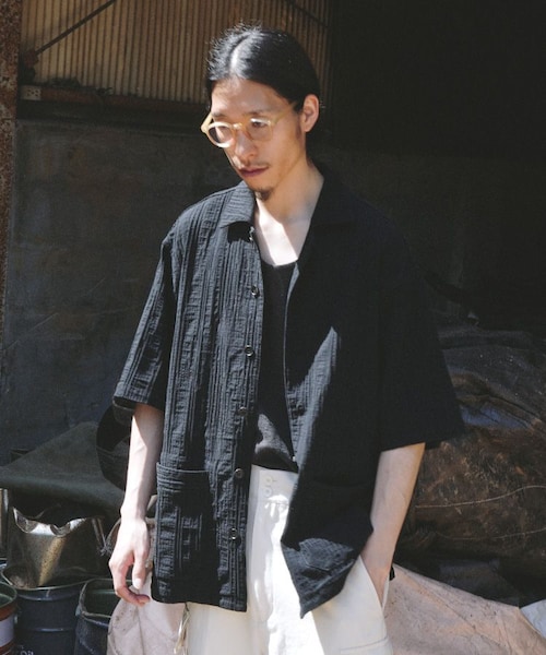 “BULGARIAN PAJAMAS SHIRT” ブルガリア軍のスリーピングシャツをデザインソースに。 オリジナルが長袖なので半袖に変更し、フロントはシンプルなシャツのディテールにしています。 フロント下部のポケットがワンポイントデザイン。 シンプルでありながらミリタリー、ヴィンテージの雰囲気のある差別化できるシャツに仕上げました。 一見ストライプに見える、絵画のような複雑な柄が特徴のジャガード素材を使用。 縦横40番手のかなり細い糸で織り上げており、非常にしなやかな肌触りです。 ヴィンテージの雰囲気が出るよう天然素材に拘り、仕上げで洗いをかけています。