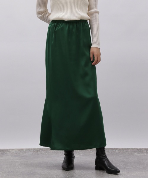 タイトすぎず、程よいフレア感で身体のラインをひろわずスッキリ見えるシルエットがポイントのサテンスカート。ウエストはゴム仕様で着脱もしやすく、ストレスフリーな着用感も◎右側だけより動きの出るようなシルエットにデザインされているのもポイントです。【素材】上品な光沢とこなれ感のある表情がポイントのサテン素材を使用。程良い肉感と、スッキリと落ち感のある滑らかな風合いが華やかで女性らしい印象に。【スタイリング】カジュアルなロゴトップスやカットトップスと合わせたスタイリングがおすすめ。スッキリしたシルエットなので、トップスは少しゆとりのあるルーズシルエットと合わせた女性らしいスタイルがバランスよく好相性〇