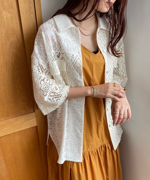 ■素材特性■パッチワークのようなデザインモチーフのレース素材を使用しています。■デザイン■あえてワークっぽいポケットでカジュアルさをプラスしたレースシャツです。縦見えするシルエットですっきりと大人っぽく着ていただけます。■スタイリング例■パンツ、スカートどちらとも相性よく着ていただけるアイテムです。適度な透け感で、インナーにカラーを持ってくるのも◎キャミワンピなどの羽織としても活躍します。