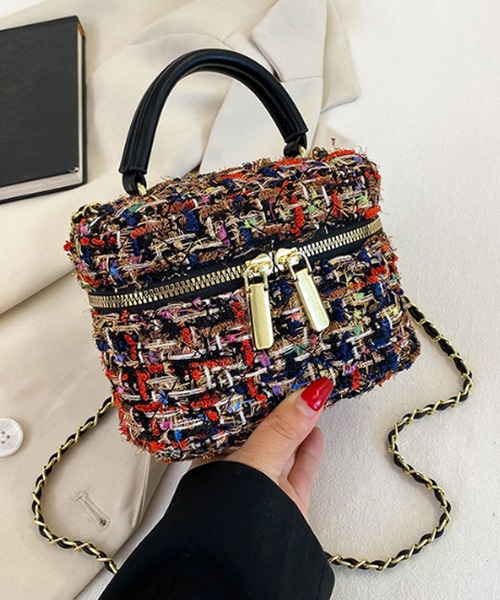 【2WAY/斜め掛け】【ラメ入りツイードが上品に輝くミニバッグ♪】大人気、レディムードなツイードバニティバッグ。キラキラ光るラメ入りツイード生地を、バニティシルエットに仕立てたオシャレなデザイン♪ワンピースやパンツルックにもマッチする、あざとかわいいトレンドアイテムです。○嬉しい2WAY仕様1way-手持ちハンドバッグ2way-斜めがけショルダーバッグiPhone、ミニ財布、ICカード、リップが入るコンパクトな容量!ガバっと上蓋が開くファスナー開閉で、荷物が見やすく使い勝手もバツグンです。きれいめカジュアルにも楽しめる大人キュートなバッグです。[仕様]メイン口:ダブルジップ開閉[サイズ/重さ]高さ12cm/横幅17cm/奥行(底マチ)8cm/持ち手高さ7cm/ショルダー紐長さ130cm220g[素材]ツイード/PUレザー/合金おすすめのシーン通勤 オフィス 通学 デート ディナー サブバッグ ピクニック 旅行など幅広くお使いいただけます。クリスマスやお誕生日などのプレゼントやギフトなどにも最適な仕上がりです。▼ブランド 【florge】 -フロージュ-「着る人の心や体を癒し包む服、何気ない日常をちょっとだけ特別な日に変えられるアクセサリー」をテーマに、おしゃれでかわいい商品からおとなめオフィスに使える商品までトレンドの人気アイテムをご提案するレディースブランドです。プチプラ商品を多く取り扱っているのも嬉しいポイント♪画像付近のブランド名からぜひご覧ください。【インフォメーション】▼商品のお気に入り登録 (カートの右のハートをクリック)完売カラーの再入荷通知を受け取ることができます。▼ブランドのお気に入り登録(上部のブランド名をクリック)新商品や再入荷の通知を受け取ることができます。