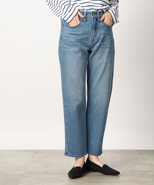 履き心地も着回し力も◎なストレートフィットデニム 【デザイン】 ややゆったりと履けるリラックスフィットのストレートデニムです。 ストレートでもリラックスしたサイジングが今年らしく、着回し力も高いアイテムです。 伸縮性が高い素材を使用している為デニム特有の窮屈感も無く、着心地も◎ ウォッシュやブラスト加工を入れててラフに仕上げていますが、あまり強くだしすぎずきれいめスタイルにもハマるようお作りしています。 ※ポケット数:横×3、後ろ×2 【素材】 綿素材にストレッチを入れたデニム生地を使用しています。 伸縮に富み、しゃがんだときも身体についていき履き心地も快適です。 ※裏地なし 【スタイリング】 細すぎず、太すぎないストレートフィットのデニムはトップスのシルエットを問わずスタイリングできて着回し力◎! 様々なスタイリングにハマるアイテムです。 加工を強くしすぎていないので、カジュアルだけでなくきれいめスタイルのはずしとしても活躍します。 モデル情報:身長166cm B80 W59 H86 着用サイズ:02(M) 店舗へのお問い合わせ商品番号:768-67027 ●製品寸法: 01(S):W67cm H87cm 股下67cm 前股上24cm 02(M):W70cm H90cm 股下68cm 前股上25cm 03(L):W73cm H93cm 股下69cm 前股上25cm 04(LL):W76cm H96cm 股下70cm 前股上25cm 05(3L):W80cm H100cm 股下70cm 前股上26cm 備考: