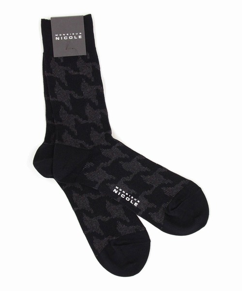 ハウンドトゥース ソックス ■素材 良質な綿糸をシルケット加工した高級感がある糸を使用。 程良い厚み感のジャガード編みでハウンドトゥース柄を表現。 ■デザイン 千鳥柄ビックモチーフをカジュアルになりすぎない配色で大人っぽく仕上げました。 足元の変化が楽しめて、ギフトにもおすすめです。 ※照明の関係により、実際よりも色味が違って見える場合があります。 またパソコン・スマートフォンなどの環境により、実際の商品と色味に若干の誤差が生じる場合があります。 予めご了承ください。