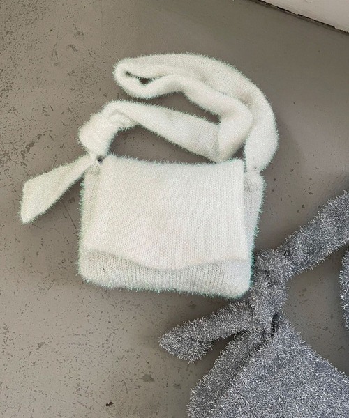 ■デザイン■ トレンドのラメ素材を使用。 幅の広いショルダーストラップとサイドのリボン、フラップデザインが特徴的です。 柔らかく軽いので荷物が少ないときにアクセサリー感覚でお持ちいただけます。 フラップはマグネットでしっかり留まるので安定感があります。 内ポケットが付いているので、小物も入れられます。 ■スタイリング例■ キラキラニット素材のショルダーBAGなのでコーディネートのポイントになります。 持つだけで一気に華やかになるので、ワントーンやシンプルなコーディネートに合わせるのがオススメです。