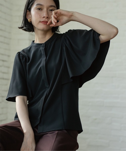 肩にかかる袖フリルデザインが華やかな、きれいめに着こなせるブラウス 【デザイン】 ・お袖がフレアになっている華やかなデザイン。二の腕も自然にカバーしてくれます! ・きれいめに着こなせるバンドカラー。 ・ボタンで前が開くデザインながら、ボタンが見えない仕様で、上品に着ていただけるアイテムです。 【素材】 ・涼やかなジョーゼット素材で、夏に最適なアイテム。 ・きれいめに着ていただける素材なのでお仕事にもオススメです。 ・マシンウォッシャブル、イージーケアの機能付きで、お手入れも簡単です。 こちらの商品は主に秋に着用いただける商品です。 モデル情報:身長168cm B76 W58 H86 着用サイズ:38(M) 店舗へのお問い合わせ商品番号:637-87015 ●製品寸法: 38(M):着丈57cm B94cm 袖丈29cm 肩幅34cm W88cm 40(L):着丈59cm B97cm 袖丈30cm 肩幅35cm W91cm 42(LL):着丈59cm B100cm 袖丈30cm 肩幅35cm W94cm 備考: