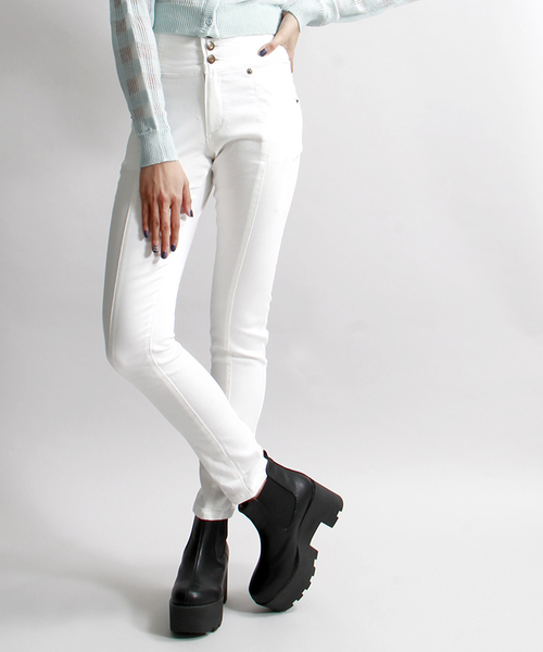 抜群のストレッチ性とフィット感が魅力のスキニーパンツ。フロントボタンが手軽に着こなしのアクセントになります。今季人気のハイウエスト仕様で、トップスをインした際に綺麗にみえるウエスト周りのシルエットがフェミニンな印象に。ボディラインに沿うようなシルエットで、美脚効果のあるひと品。シンプルなデザインなので様々な着こなしに合わせて頂けます。定番のデザインながら、細部やシルエットにこだわり、年をまたいで長くご愛用頂けます。 ※画像の商品はサンプルです。 実際の商品と仕様、加工、サイズが若干異なる場合がございます。 WEGOの特集ページはコチラ