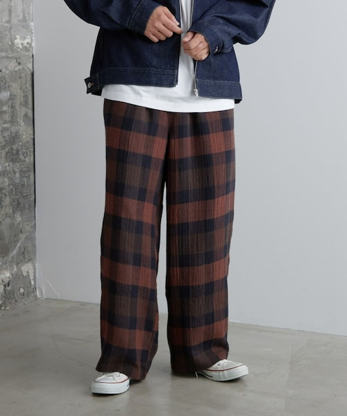 落ち着いた配色ながら、おおきめのチェック柄が様になるイージーパンツ■デザイン落ち着いた配色ながら、おおきめのチェック柄がカジュアルな印象のガーゼパンツ。表面は立体感があるので、レトロな雰囲気の柄遣いが着用時も存在感を発揮してくれます。程よいリラックス感のあるシルエットとウエストゴムで楽な履き心地◎■スタイリング シンプルなトップスはもちろん、プリントTシャツやジャケットなどどんなアイテムとも相性抜群◎ カジュアル要素を取り入れれば、リラックス感のあるスタイリングが今年らしくてオススメ!ユニセックスでお使いいただけるのでお揃いやプレゼントにもピッタリです。同素材のシャツとのセットアップでの着用もおすすめです。⇒ウールガーゼノーカラーチェックシャツ【TYZ2032104A0004】\SOUNDS GOOOODのおすすめアイテム!/・セットで着るとさらにおしゃれ度アップ!⇒【SOUNDS GOOOOD / サウンズグッド】ウールガーゼノーカラーチェックシャツ・トレンド感あるトラックパンツ!⇒【SOUNDS GOOOOD / サウンズグッド】トラックパンツ■スタッフコメント(158cm womens)ウエストに紐がついているのでベルトなしで問題なく履けました。夏はプリントTシャツに、秋冬はスウェットやニットに合わせたいです!(177cm mens)ガーゼ素材なので肌触りが良くリラックス感ある履き心地でした。サイズはONE SIZEですが窮屈感はなくゆったり履けました。・・・・・・・・・・・・・・・・・・・・・・透け感:なし裏地:あり伸縮性:ややあり光沢感:なし生地の厚さ:やや薄め【ウエストサイズ】ONE:80(最小) ~ 104(最大)・・・・・・・・・・・・・・・・・・・・・・■お手入れ方法洗濯:液温は40 ℃を限度とし、手洗いができるアイロン:底面温度110 ℃を限度としてスチームなしでアイロン仕上げができるタンブル乾燥:不可【SOUNDSGOOOOD/サウンズグッド】ハッピーで陽気なカリフォルニアの文化をファッションを通じて提供。サーフ、スケート、ミュージックを中心とした西海岸のストリートカルチャーからインスパイアされた要素に、レトロでポップなカラーリングをミックスさせたユニセックスで楽しめるアイテムを展開。“なんかいい” のフィーリングで人生を楽しむ人に向けたブランド。▼気になる商品を登録ハートをクリックして《お気に入り登録》がオススメです!セール情報や完売カラーの再入荷通知、ラスト1点の通知などを受け取ることができます!▼ブランド新商品や再入荷など、ブランド情報をいち早く受け取ることができます!※画像の商品はサンプルです。 実際の商品と仕様、加工、サイズ、素材が若干異なる場合がございます。