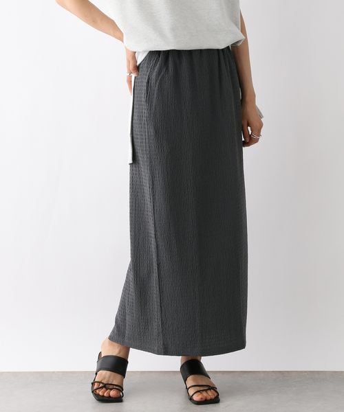 ーーー 表面感が特徴の表情のあるスカート ーーー 【デザイン】 カット素材で伸縮性もあり動きやすさ抜群のスカートです。 シンプルなデザインですが、シャーリングジャガードデザインがポイントになります。 すっきり見えするシルエットで合わせるトップスも悩まず使いやすいです。 【スタイリング】 ・チュニック丈のトップスやシャツを合わせて夏らしいコーディネートに。 ・足元をサンダルで抜け感をプラスした合わせ方もおすすめです。
