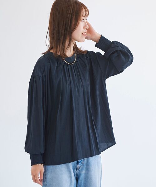 昨年人気だったサテン素材のブラウスがアップデートして登場。 ハイネックとゴールドボタンがアクセントになった秋の始まりにぴったりのクラシカルなデザイン。 ●ポイント 前シーズンより衿ぐりを少し低くし、着やすくなりました。ボタンは球体にアップデート。 前後2wayで印象を変えて着られます。 ゆったりシルエットですが、ハイネックと袖口シャーリングが引き締め役に。 ●おすすめコーデ テーパードパンツと合わせたオフィススタイルからデニムとのカジュアルコーデも楽しめます。 ジャケットやカーデのインにもおすすめです。 ==================== 透け感:(グレージュ)若干あり 伸縮性:なし 光沢感:ややあり 生地の厚さ:やや薄手 ==================== 【スタッフ着用コメント】 <スタッフA> 20代後半/154cm/骨格ストレート/普段サイズ36/着用サイズ38 サイズ感: 全体的にゆとりがある。 素材感: とろみのある素材で肌触りが良い。 着用感: 肩に落ち感があるのでカッチリしすぎない。 <スタッフB> 30代/161cm/骨格ウェーブ/普段サイズ36-38/着用サイズ38 サイズ感:ヒップにかかる位の着丈です。 素材感: とろみのある柔らかい素材感です。 着用感:軽く肌触りがさらっとしているので着心地がいいです。