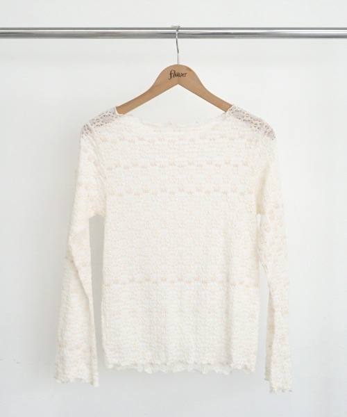 お花柄レースがキュートなトップス♪ 透けすぎないので一枚ではもちろん、キャミワンピースやビスチェとの レイヤードインナーとしてもお使いいただけます。 ネックや袖などポイントになる部分をメローフリルに仕上げ、華やかに♪ フレア袖で、ラフさのある大人めフェミニンな雰囲気を演出します。 デイリー使いからデートやお出かけまで、幅広く活躍します。 ※アイボリー生地にベージュの混色がございますが、 生産上避けられないものの為不良ではございませんのでご了承下さい。 ※ベージュの着用画像はサンプルを使用しております。 実際にお届けするもののサイズは下記サイズ欄をご覧下さい。 ribbon knit bustier、wavy sheer onepieceなどとのレイヤードがおすすめです♪ 【お買い物を上手にお楽しみいただくためのPOINT2つ】 ◎ 購入ボタン横の ♡ (ハートマーク)をクリック! 完売カラーの再入荷通知、残り1点の通知、セールの通知を受け取れます。 (クリックまたはタップで商品のお気に入り登録♪) ◎ ショップのトップページにある ♡ (ハートマーク)「お気に入りショップに追加」をクリック! 新商品や再入荷等、いち早くブランドのお得な情報を受け取れます。 (ブランドのお気に入り登録♪)