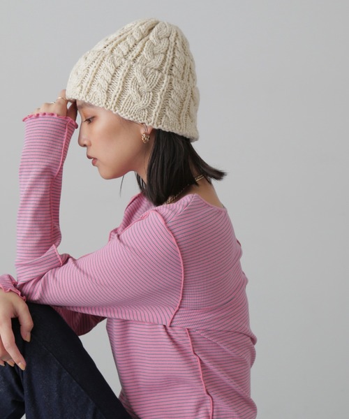 秋冬スタイルのアクセントにぴったりなニット帽。 シンプルな折り返しのデザインは、ふっくらと暖かみのあるケーブル編みが映えるアイテム。 カジュアルスタイルをはじめ、ジャケットやトレンチコート、ワンピースと合わせたキレイめコーディネートの外しにもおすすめです。 ※モデルの着用画像の場合、光の当たり具合により、実際の色味と異なって見えることがございます。 色味は、商品単体の画像をご参照ください。