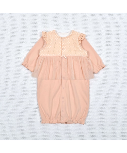 伸縮性があり着心地の良いベアフライス素材の女の子用2WAYオールです。2WAYオールにチュニックを重ね着したように見えるデザインがとても可愛いアイテムです。 お色は甘く可愛らしさを引き立てるオレンジと清潔なホワイトの2色です。 光沢のあるサテンリボン、透け感のあるチュールフリルが愛らしいポイント。 ホワイトは結婚式などのセレモニーやお宮参りにもご着用いただけます。 ホックの留め方で繋がった形状、足付きカバーオールとして2WAYでご着用いただけます。 新生児期はドレスオールとして、足の動きが活発になってくる3ヶ月頃からはパンツ型にして着るなど、お子様の成長に合わせてスナップボタンでドレス型、パンツ型の2通りで着用可能◎ つかまり立ちができて、上下セパレートを着せやすくなるまで長い期間活躍します。 胸元がレース切り替えになっていて上品な印象の2WAYオールは、可愛いリボンヘアバンド(1754-56097)、レーススタイ(1754-56020)と合わせて、退院祝い、出産祝いにもよろこばれるアイテムです。 【fillot de bebe reduction (フィヨ・デュ・ベベ・ルダクティオン)】 ヨーロッパのベビーを意識し、上品で洗練されたシンプルさを大切に新生児服としての機能性、トレンドも採り入れたスタイルを提案します。 ”クラシック”=普遍的な安心感 ”ノスタルジック”=懐かしさからインスピレートするぬくもり 2つのテイストを取り入れ、赤ちゃんの日常的なパリスタイルを表現するブランドです。