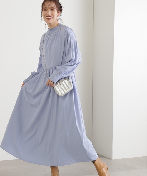 1枚でスタイリングが完成するワンピースは、袖口内側と襟ぐりのシャーリングデザインがさり気ないポイント。肩まわりの切り替えやピンタックで華奢見えフォルムを演出し、女性らしく着用できます。ジャケットインはもちろん、今年注目のふわふわとした素材感のジレなどとレイヤードするのもお勧めです。**********************透け感:なし裏地:あり伸縮性:なし光沢感:ややあり生地の厚さ:普通**********************