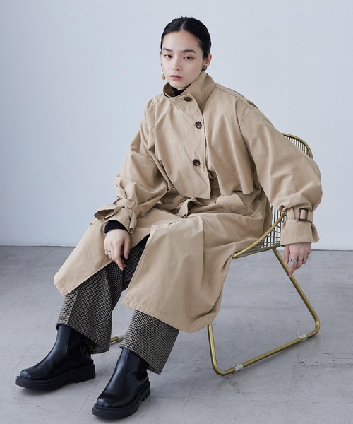 定番のトレンチコートは手軽なアウターとして一つは持っておきたいアイテム。立て襟と胸元のヨークで少し個性を取り入れたデザインは、いつもと違ったトレンチコーデも楽しめる。ボタンを全て留めてウエストベルトでキュッと締めれば英国風のレトロスタイルになり可愛い。もちろん、いつものカジュアルコーデにサラッと羽織っても。薄手の軽い素材感で、ちょっとそこまで、のスタイルにも対応。ワンピやスカート、パンツでもなんでも合わせやすいロング丈でどんなコーデにもぴったり。【備考】・裏地あり・ウエストベルト取り外し可能・サイドポケット×2