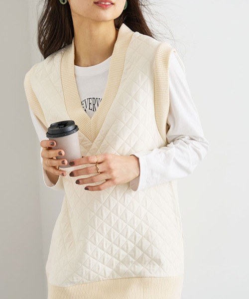 今季注目の「キルティングベスト」で秋冬コーデの鮮度をアップ。 薄手ながら暖かく、キルトとリブの切替が今年顔。 深めのVネックとゆったりシルエットで、合わせるインナーを選ばず、体型カバーも ※商品によって柄の出方が異なる場合があります。 サイズ:M、L、XL(LL) カラー:アイボリー、ブラック、カーキ --------------------------------------------------------------------- ※サイズ寸法は実際の寸法と多少の誤差がある場合がございます。 ※ご覧いただいているPC/WEB環境や撮影環境により、 多少色味が異なって見える場合がございます。 【お買物をよりお楽しみいただく為に】 ▼商品のお気に入り登録をおすすめします♪ 『♥をクリック!』 完売カラーの再入荷やラスト1点の追加、 セールの際の通知を受ける事ができます。 ブランドのお気に入り登録もご一緒にお願い致します。 --------------------------------------------------------------------- 洗濯:洗濯機OK