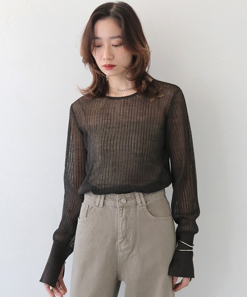 <<<1枚でもインナーとしても着れる万能ラメシアートップス>>>【POINT】・極細のラメ糸が入った糸で編みあげた、シアーリブニットです。・ラメの主張が強くなく、程よいシャイニー感があるので、着用した時の透け感と相まって上品な印象になります。・タイトめなシルエットでありながら体のラインを拾いすぎないサイズ感は、ちょっとした緩さがでてニュアンス感のあるアイテムになります。【STYLING】・厚手のニットに合わせて抜け感を出したり、ジレやキャミワンピースのインナーなど、一枚で着ても映える幅広く使える一着です。・レイヤーするアイテムによって、ロングシーズン着用できます。・今すぐ着れる秋服で、春先にも着用していただけるので着回し力抜群です。【FABRIC】◆透け感:あり◆厚み:薄手◆裏地:なし◆伸縮性:あり※撮影場所により、実際の色味と若干異なる場合がございます。 あらかじめご了承くださいませ。【お買い物におすすめの便利機能】※商品のお気に入り登録完売カラーの再入荷時や、ラスト1点の時、セール開始時にお知らせ致します。※ブランドのお気に入り登録新商品や再入荷、セール情報等、いち早くブランドのお得な情報を受け取る事が出来ます。ぜひご活用ください。