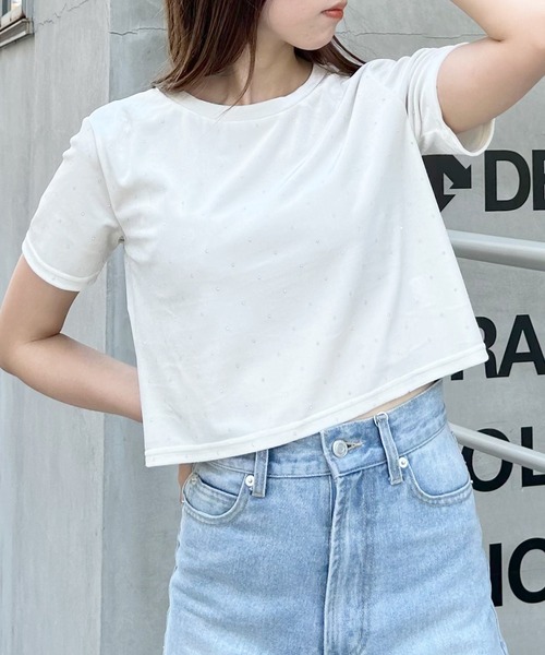 2023 SS 春夏アイテム 全体に小さなラインストーンを散りばめた華やかなTシャツ。光沢のあるベロア素材との組み合わせで印象的なアイテムに仕上げています。短めの裾丈でバランス良く合わせられるのも◎。伸縮性のあるやわらかな生地で着心地も快適です。1枚ではもちろん、インナーなどを合わせたレイヤードスタイルもおすすめ。ベーシックで落ち着いたカラーが揃っています。【以下グレー参考。カラーにより多少の誤差あり】・透け感:透けない・伸縮性:あり・生地の厚さ:薄い・裏地:なし