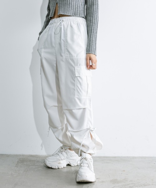 女性らしく着られる人気のカーゴパンツ新色のディープピンクはWEB、HEP FIVE店、ジョイナス横浜店限定カラーです■デザイン・カジュアルなアイテムですが、裾リボンで可愛らしくコーディネートできます。・ポリエステル100%の柔らかい生地で履き心地が良く、見た目もカジュアルすぎないです。・裾にはスリットが入っているので、程い肌見せができます。・総ゴムで誰でも履きやすいのも嬉しいポイント。・オフホワイトは裏地が付いており透けにくい仕様です。■カラー・オフホワイト/サックス/ピンク/ブラック/ディープピンク(ピンク系その他)の5色展開です。■スタイリング・トレンドのクロップド丈のトップスと相性抜群。・カップ付きインナーにカーディガンを羽織ったスタイルもおすすめ。・足元は厚底スニーカーでスポーティに◎ ■カラー ・オフホワイト/サックス/ピンク/ブラック/ディープピンクの5色展開です。 ■スタイリング ・トレンドのクロップド丈のトップスと相性抜群。 ・カップ付きインナーにカーディガンを羽織ったスタイルもおすすめ。 ・足元は厚底スニーカーでスポーティに◎ ■スタッフコメント ・152cm/骨格ウェーブ さり気ないスリットが抜け感プラスできるカーゴパンツ。 オリーブのカーゴは低身長さんに毎回大人気のサイズ感でおすすめ! ・155cm/骨格ストレート ゆったりシルエットで足のラインをひろわないので体型カバーになります〇 骨格ストレートさんは短丈かジャストサイズのトップス合わせがスッキリ見えです。 ・166cm/骨格ウェーブ 程くゆったりしているので体型カバーもできます◎ クロップド丈のトップスでウエスト肌見せさせるのがおすすめ。 ■POINT夏服、夏コーデ、秋服、秋コーデ、ワイドパンツ、ナイロンパンツ、ハイウエスト、リボン、カラーパンツ、韓国ファッション、韓国コーデ、スポーティ、低身長 ------------------------------- 裏地:あり(オフホワイトのみ) 光沢感:なし 透け感: ややあり(オフホワイト) 伸縮性:なし 手洗い: 可能 タンブラー乾燥: 不可 アイロン: 150℃まで ------------------------------- model:162cm ※オフホワイトは下に濃い色など着用しますと透け感が出てしまいますので、インナーパンツの着用がおすすめです。ご理解のほどお願いいたします。 ※着用、お取り扱いの際は、商品についている品質表示とアテンションタグを必ずご確認下さい。 ※ご覧のモニター環境や撮影環境により実際の商品と多少色味が異なって見える場合がございます。 ご理解の程よろしくお願いいたします。■お気に入り登録のおすすめ【気になるアイテムを登録】ハートをクリックしてお気に入りに登録すると完売カラーの再入荷やラスト1点の通知、セールの通知を受けとることができます。【ブランドを登録】新商品や再入荷、セール通知など、いち早くブランドの情報を受けとることができます。