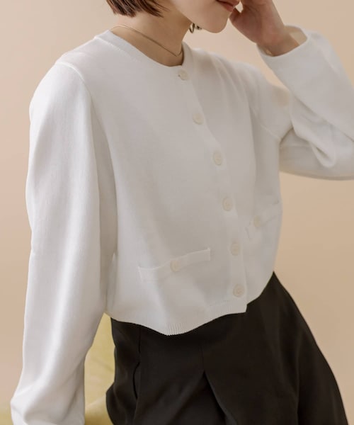 サイズ感がかわいい◎ポケット付きのちびカーディガン。商品ポイント・カラーにときめく秋冬にマストなカーディガン。・ショート丈アイテムなのでスタイルアップ◎・袖口が細いデザインなのですっきり見せてくれます。・ミニポケットがシンプルなカーディガンのワンポイントに。スタイリングポイント・ハイウエストやワイドなボトムスとの相性◎・シンプルなスラックスやデニム合わせもおすすめです。※洗濯、取り扱い洗濯:手洗い可アイロン:低温110℃まで スチームなし(あて布使用)タンブル乾燥:不可-----------------------------------------------------裏地:なし伸縮性:あり光沢感:なし生地の厚さ:ふつう------------------------------------------------------ 商品のお気に入り登録➡ お気に入りアイテムの値下げ・再入荷・在庫1点などの通知を受け取ることができます。 ブランドのお気に入り登録➡ 新商品や再入荷、セール、クーポン配布などお得な情報を受け取ることができます。 ※サイト上のカラー名と、お届け商品に記載されているカラー名が異なる場合がございます。 ※商品の色味は、撮影場所や光のあたり具合などにより色味が違って見える場合が御座います 。 また、お客様のお使いのPCのモニター環境などにより色味が違って見える場合が御座います。予めご了承の上ご注文下さい。 ※ご注文いただいた予約商品のお届け時期の確認は、注文履歴ページより行えます。------------------------------------------------------