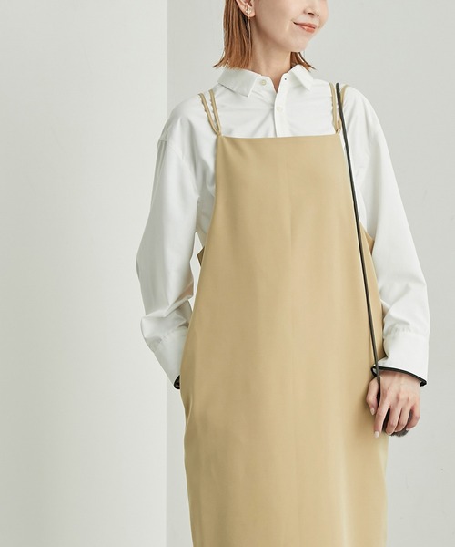 繊細なストラップが大人なレイヤードスタイルをアシスト。【素材感】・薄手のダブルクロス素材を使用しており、体のラインを拾いにくくシワにもなりにくいのがポイント。【デザイン・シルエット】・ダブルストラップデザインのキャミソールワンピース。・片方のストラップはバッククロスで後ろ姿が印象的に。・すっきりとしたシルエットながら、バックスリット入りで足捌きが良い。【スタイリングポイント】・晩夏から初秋は、カジュアルなボーダーカットソーやTシャツを重ねて。・布帛のブラウスやタートルニットを合わせると大人っぽく仕上がる。・足もとはショートブーツがおすすめ。・ワンピースとしても、上からミドルゲージニットを着てアイラインスカート使いにも◎-----------------------------裏地:あり透け感:なし伸縮性:なしポケット:ありファスナーなしその他仕様:肩ひも調節可能生地感・厚さ:普通季節:通年-----------------------------※撮影時の光、お使いのモニター環境によって色の見え方が違う場合がございます。※モデル身長:165cm 着用サイズ:38