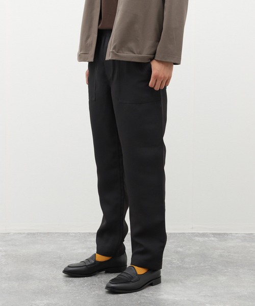 ■デザイン スラックスライクな雰囲気のテーパードイージー型パンツを、ミリタリーディティールを加える事で男らしい印象にデザインしました。 キレイ目パンツとミリタリー要素がMIXされた程よいムードがポイントです。 ■素材 ポリエステル100%の綾目の立った織りが特徴的の素材感。 厚すぎず薄すぎずの丁度良い生地感なのでシーズンレスで使用できます。 【ご注意】 ※照明の関係により、実際よりも色味が違って見える場合があります。 またパソコン・スマートフォンなどの環境により、若干製品と画像のカラーが異なる場合もございます。 ※商品の色味は、商品アップ画像をご参照ください。 モデルサイズ:身長:180cm 着用サイズ:L 本体:手洗い可能