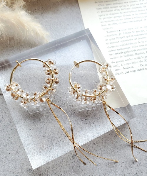 落ちにくいシリコンカバー付きにリニューアル! 美しい水滴のようなガラスビーズとツイストチェーンが 水滴の流れのようなデザインのイヤリング。 フープは3cmと大ぶりながら、 ガラスビーズと揺れる華奢なチェーンの組み合わせで 女性らしさのある上品なデザインです。 つぶつぶのガラスビーズが光りで透ける姿が 顔まわりを明るく魅せてくれます。 華やかなシーン、ドレッシーなスタイル、 ウェディングアクセサリーとしてもコーディネートしていただけるアイテムです。 【素材】 フープイヤリング・真鍮にK16GPコーティング チェーン・18KGP真鍮 ガラスビーズ 【サイズ】 全長 約11.5cm 重さ 約6.2g(片側) 《K16GPとは》 16金ゴールドコーティング 金の配合率を高めた金属でコーティングすることにより、煌めきが増して変色しにくくなっております。 《お取り扱いの注意点》 商品は優しくお取り扱いください。 長く楽しんでいただけるよう、使用後は柔らかい布などで 拭いて保管をお願いいたします。 金属アレルギー対応商品は 全ての方に反応がでないという訳ではありません。 ◆MILIA(ミリア)について◆ 透明感とモードを掛け合わせた、大人の女性を楽しむアクセサリーを製作しています。 天然石や淡水パールなどの天然素材と、サージカルステンレスや14kgf(14金ゴールドフィルド)素材などの長くお使い出来て高品質なものを取り扱っております。 金属アレルギーの方にも楽しんでいただけるアクセサリーをお届けいたします。