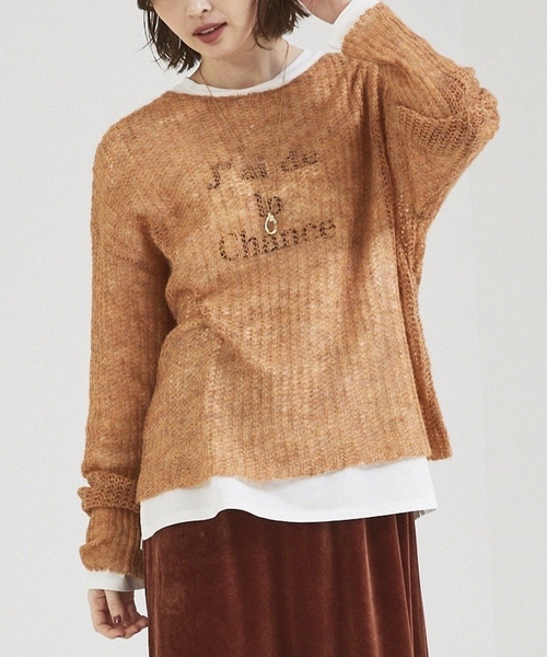 【Design】シースルー見えのローゲージニットプルオーバー。メッシュのようなザックリ編みと長めの袖が女っぽさを高めるニット。インナーにタンクトップやプリントTをレイヤードして色々なコーデが楽しめるアイテム。 【Fabric】 モヘアのような毛足のあるニットでフワッとした手触りです。ザックリ編みの透け感を楽しめます。 【Styling】 透け感を活かして、ロゴTやボーダーのインナーを入れたり、早めの時期はタンクトップとのレイヤードがおススメ。